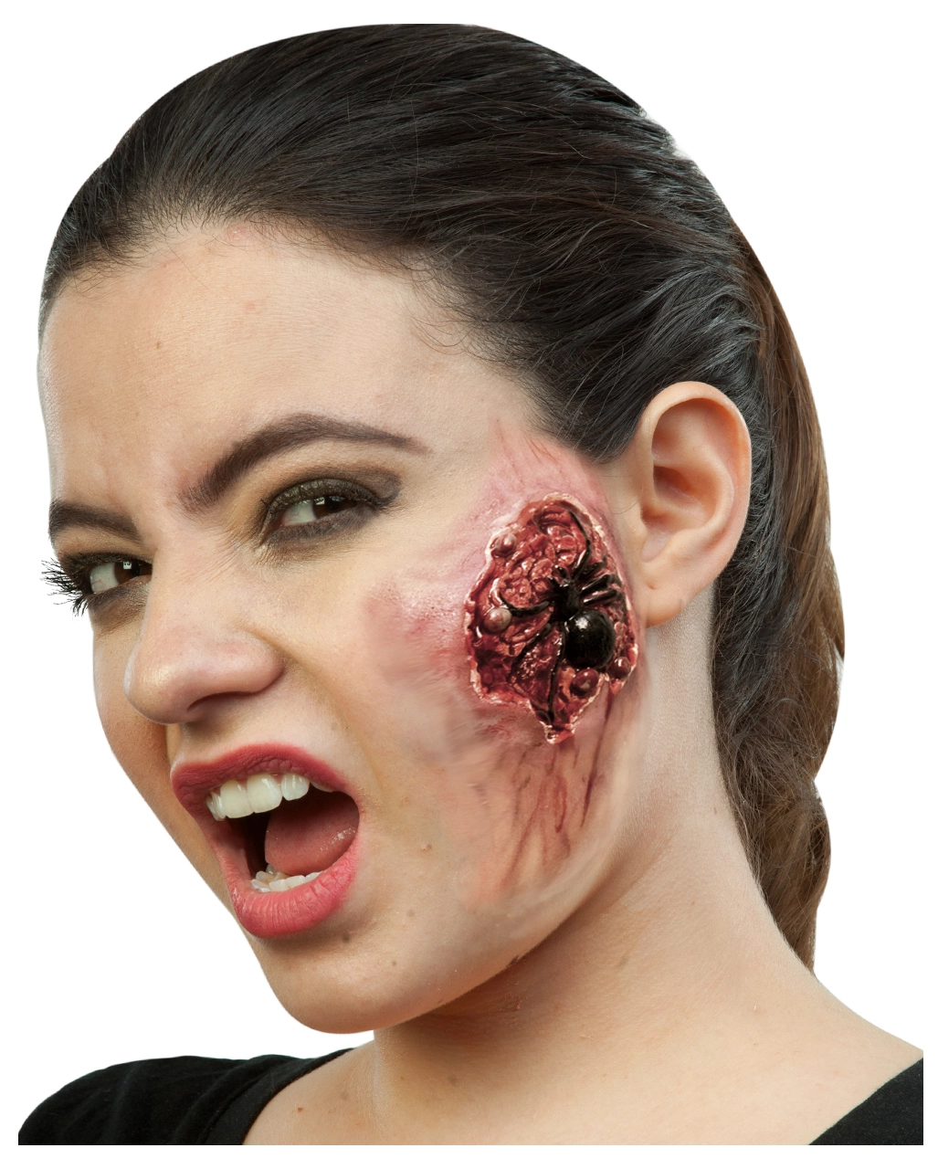 Besonders eklige Halloween Latex Applikation mit einer Spinne in der Wunde