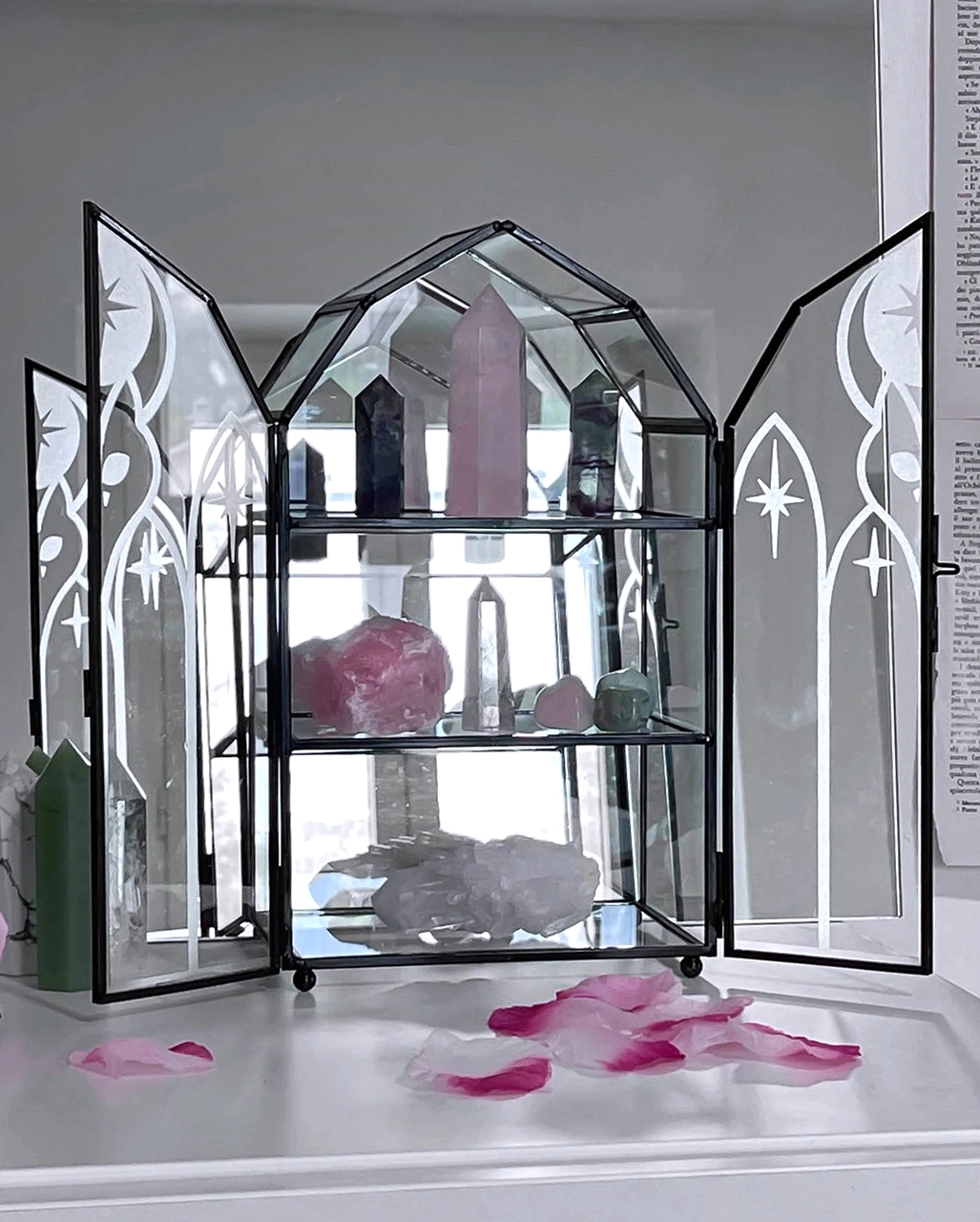 Unsere Cathedral Glas Vitrine KILLSTAR ist das ideale Gothic Wohnaccessoire für deine alternativ eingerichtete Gruft. Du legst schließlich viel Wert auf den ein oder anderen stilvollen Akzent in deiner Einrichtung. Die kleine Gothic Vitrine ist dafür ideal. Ganz gleich, ob du Giftflaschen, mystische Steine oder Schmuck darin sammelst, diese wunderschöne Glasvitrine bereichert die besondere Atmosphäre in deiner Bude.