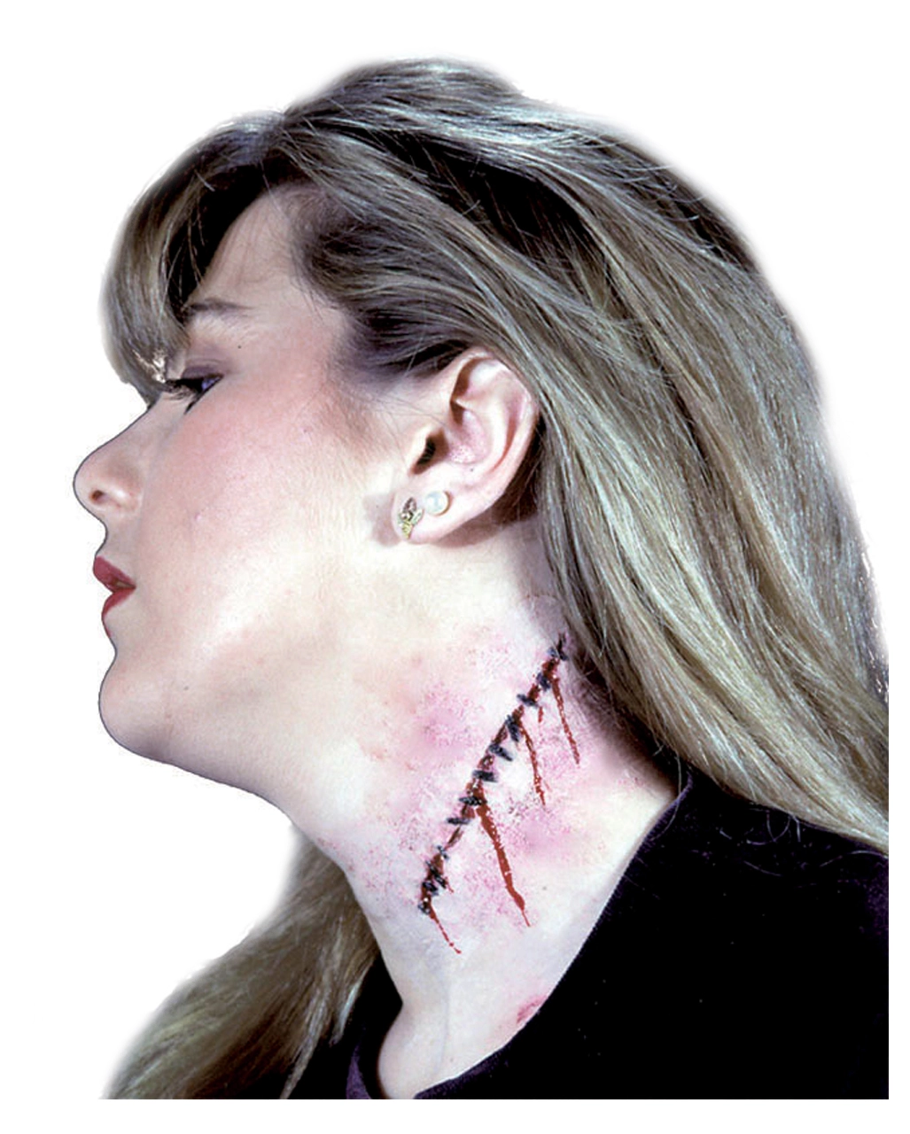 Schminke dich zu Halloween und Fasching als Unfallopfer mit frisch vernähter Wunde, die am Aufplatzen ist. Was gibt es Schlimmeres, als eine frisch genähte Wunde die wieder aufzureißen droht? Mit der Latexapplikation einer genähten Wunde, kannst du dich als Unfallopfer oder als letzter Überlebender aus einem Slasher-Film à la “Freitag der 13.” und “Halloween” schminken.