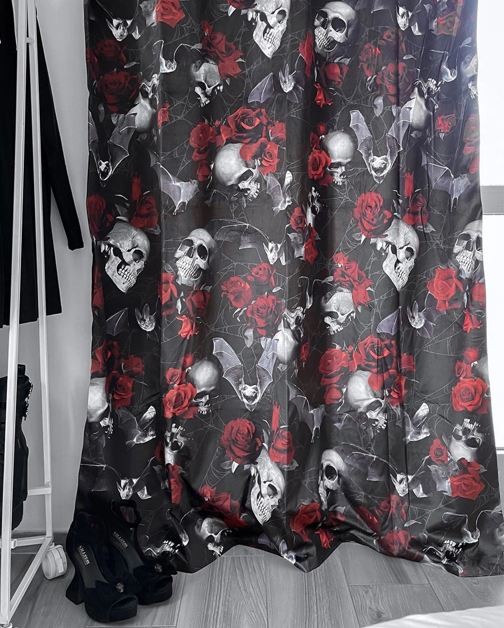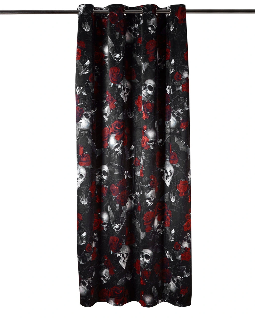 Der Haunted Garden Vorhang KILLSTAR ist ein Gothic Wohnaccessoire für Fans von düster-romantischer Deko. Der Gothic Vorhang ist aus Velours und zeigt einen Print mit Totenköpfen, blutroten Rosen und Spinnenweben auf schwarzem Grund. Der Vorhang aus der Haunted Garden Reihe von KILLSTAR ist 182 x 138,5 cm groß und hat Metall Ösen zum Aufhängen.