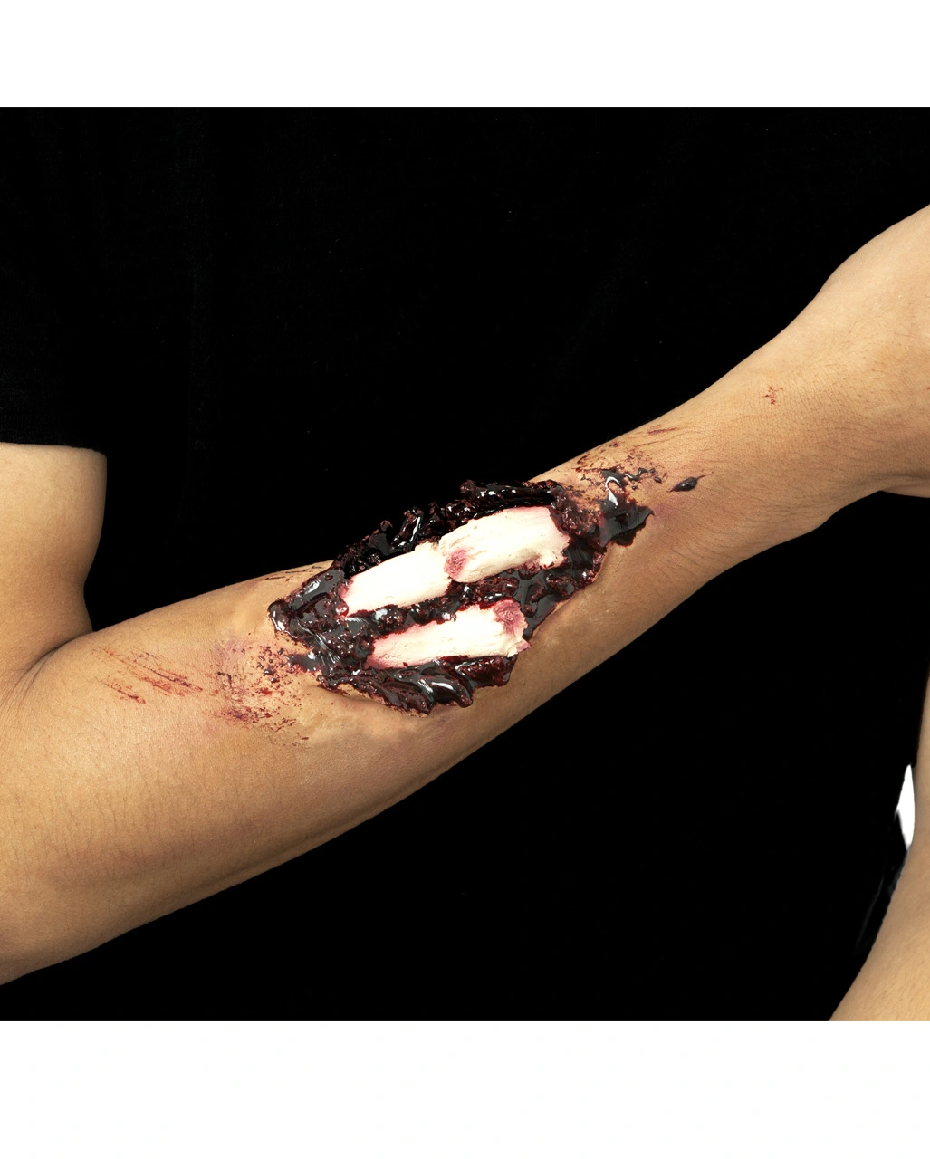 Die imposante Knochenbruch Latexapplikation ist bereits coloriert und besteht aus hochwertigem Latex und wird mit Mastix Hautkleber klein oder Flüssiglatex auf die Haut montiert. Optional noch mit Flüssiglatex, Make-up und Spezial FX Kunstblut die Übergänge kaschieren und fertig ist dein krass aussehendes Halloween Make-up. Perfekt lässt sich die Knochenbruch Latexwunde mit unserem SFX Kit Unfall Wunden Schminkset schminken. Nach Gebrauch lässt sich die Latexapplikation einfach wieder entfernen und immer wieder verwenden. Mastix Hautkleber, Flüssiglatex & Filmblut nicht inkl.