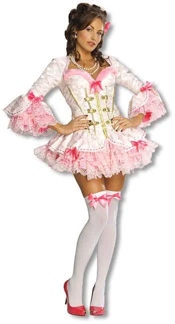 Schon die Pompadour hätte das Madame Mon Ami Kostüm getragen, wenn es damals schon schick gewesen wäre. Das sexy kurze Halloweenkostüm ist aber auch ein wirklich Blickfang. Bei diesem Damenkostüm kommt ein edler Mix verschiedenr Materialien zum einsatzt und macht die extravagante Verkleidung für Halloween und elegante Kostüm für Karneval zu etwas besonderem. Das Karnevalskostüm eines sexy Funkenmariechen hat ein Oberkleid aus weißem Satinstoff welcher ein kastenförmiges Muster mit goldenen Punkten hat. Daran schließen sich die Ärmel an die in üppigen Trompeten aus rosafarbenen Stoff und weißer Spitze münden. Der Stil der Karnevalsverkleidung ist an ein Barockkleid angelehnt. Der Rock des Halloweenkleides ist glockig und relativ kurz gehalten und wie die Ärmeltrompeten mit reichlich rosafarbenen Stoff und weißer Spitze unterlegt. Das Oberteil der tollen Halloween Verkleidung hat am Ausschnitt einen Einsatz aus rosafarbenem Plüsch und goldene Zierbänder und Knöpfe die an eine Militärjacke erinnern. Das Kostüm ist an den säumen mit rosafarbenen Bändern durchzogen und hat diverse Schleifen. Im Lieferumfang des Halloweenkleid ist die Haarschleife und die Overknee Strümpfe mit Schleifen enthalten. Andere sexy Kostüme wie das Spinnen Fledermauskostüm und das Sexy Teufelsbraut Kostüm ML findest du im Sortiment des Karneval Shop. Größe L entspricht 40/42