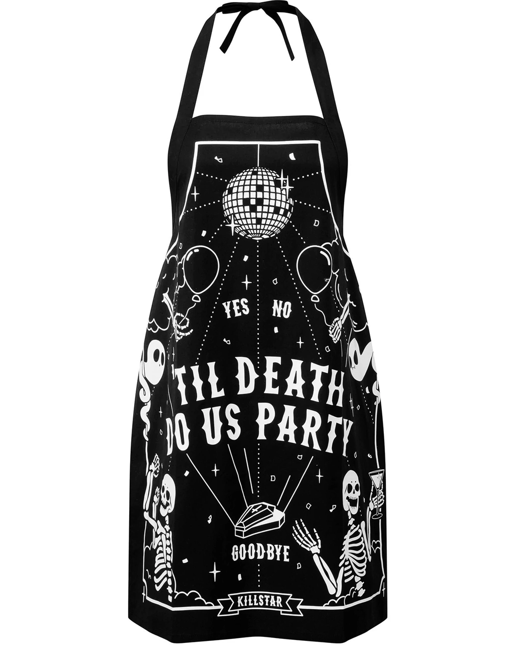 Mit unserer Party Animal Kochschürze KILLSTAR kannst du leckere Köstlichkeiten zaubern und deine Killstar-Klamotten sauber halten. Die Schürze ist aus schwarzem Stoff und hat einen auffälligen Kontrastdruck, der deiner Küche eine gewisse Attitüde verleiht. Die Gothic Kochschürze zeigt nämlich ein paar hart feiernde Skelette, die sich im Schein einer Disco-Kugel vergnügen. Passend dazu gibt es bei uns für deine perfekt ausgestattete Küche den Hexenkessel mit Löffel als Suppenschale.