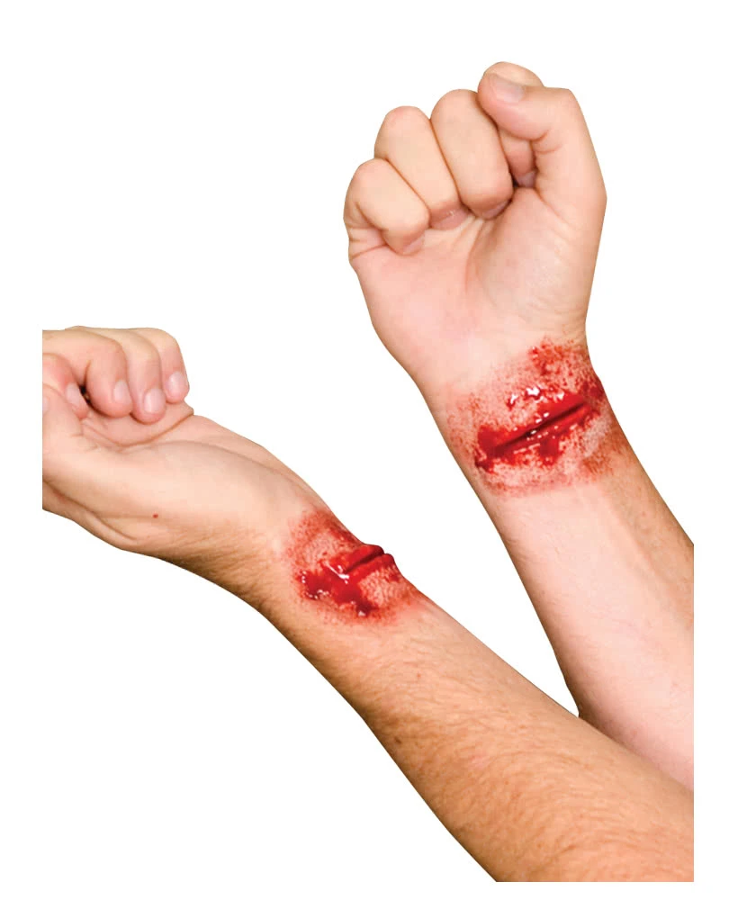 Unzählige Horrorfilme & Thriller befassen sich mit dem Thema Selbstmord oder vorgetäuschtem Suizid. Bist du als Make-up Artist und Maskenbildner gefragt eine Wunde zu schminken, die aufgeschlitzte Pulsadern zeigen sollen? Dann ist unsere 2-teilige Pulsadern Massaker Latexapplikation genau das richtige.