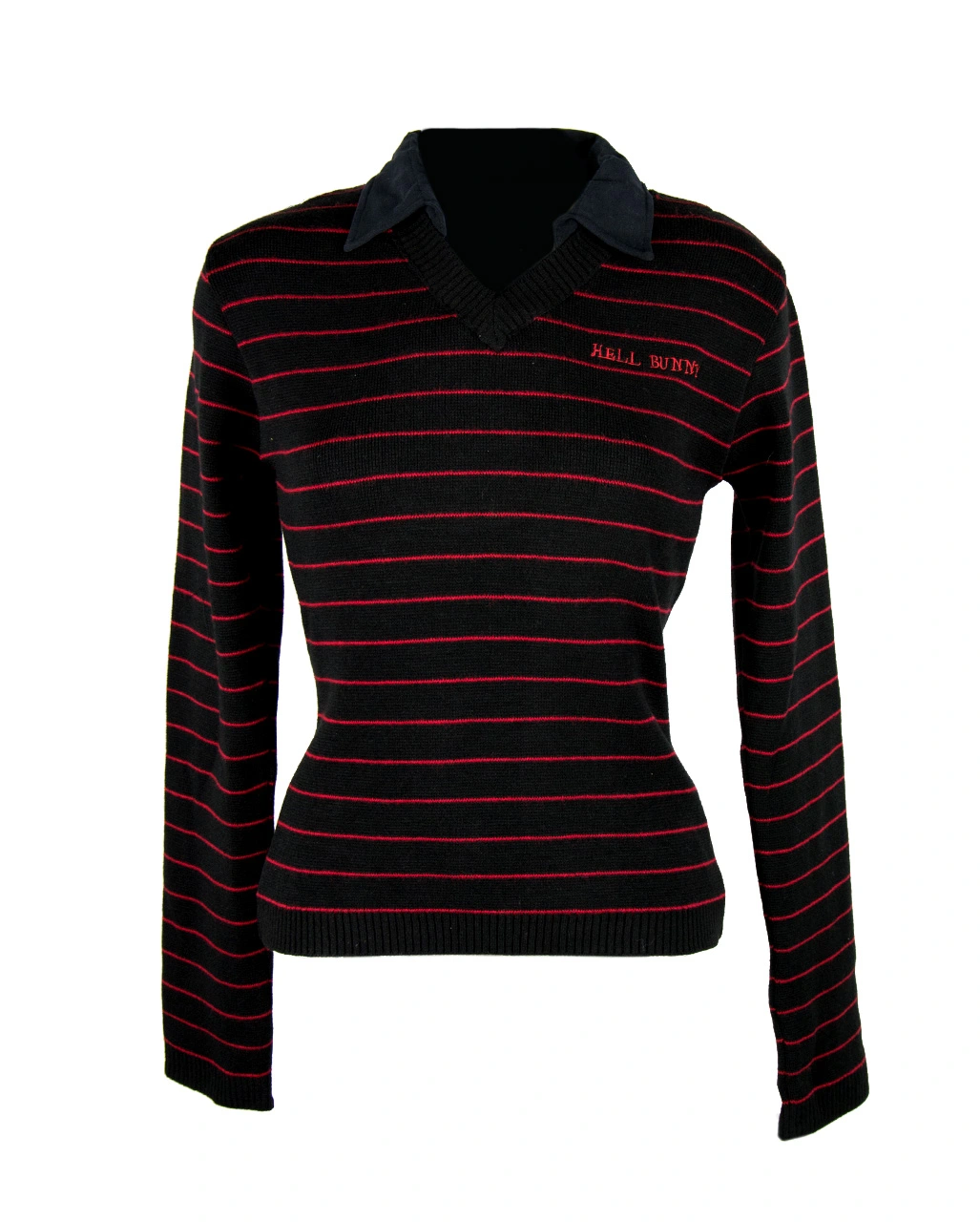 Unser Schwarz-Rotes Lilly Jumper Shirt in Größe M/L ist ein gestreiftes Damen Langarm-Shirt mit und Polo-Kragen. Die Gothic Fashion lässt sich auch sehr gut mit Punk-Mode tragen und vielseitig kombinieren. Weiche Baumwolle sorgt dabei für höchsten Tragekomfort und ist angenehm zur Haut. Entdecke passend dazu die Ringelstrumpfhose schwarz-rot