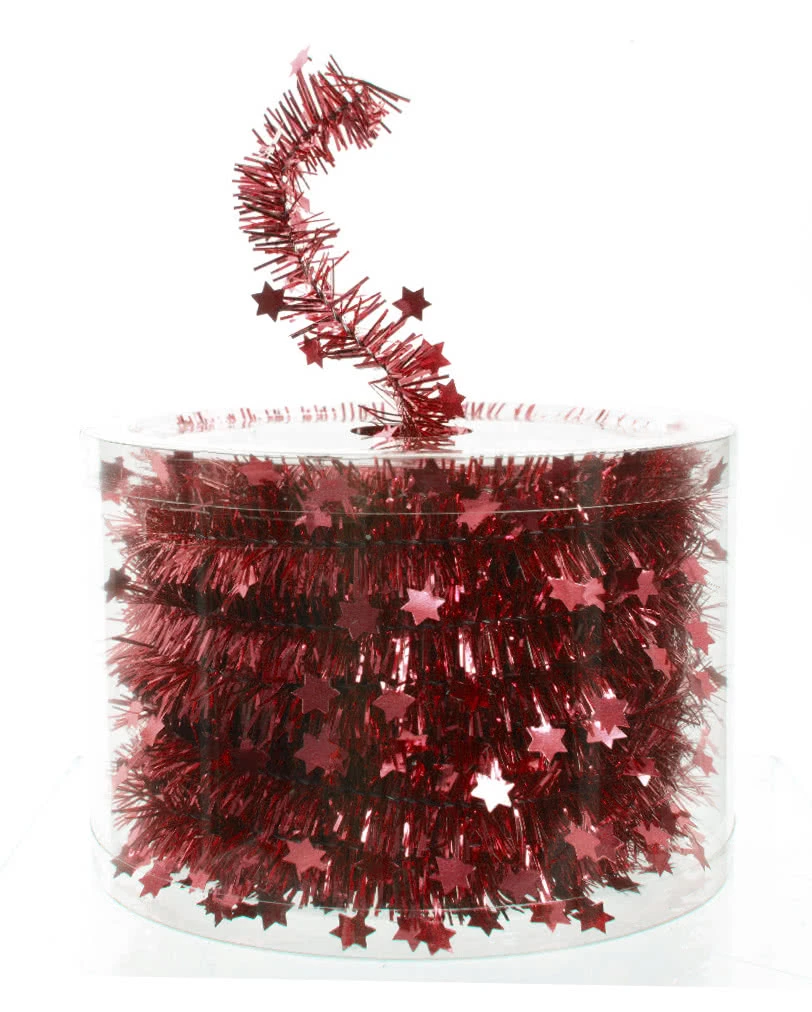 Die Sterngirlande in dunklem Bordeauxrot hat eine Länge von 7 m und eine Breite von 3,5 cm. Ein gewundener Draht hält dunkelrot glänzende Lamettastreifen und -Sterne zusammen und garantiert, dass die weihnachtliche Dekoration mit Leichtigkeit an Fenstern, Türen und Weihnachtsbaum angebracht werden kann. Auch an Geburtstagen, Hochzeiten und anderen Festen kannst du deine Wohnung mit der erstklassigen Deko-Girlande schmücken. Noch deinen Christbaum mit Lametta in Bordeauxrot und der Lametta-Girlande in Anthrazit 2,7m dekoriert und Weihnachten kann kommen!