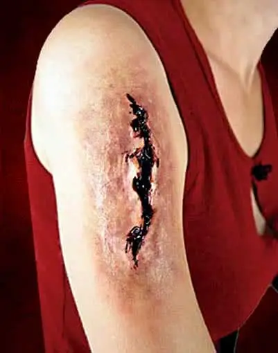 Extrem, plastische Latexwunde als krasser Halloween Make Up Effekt